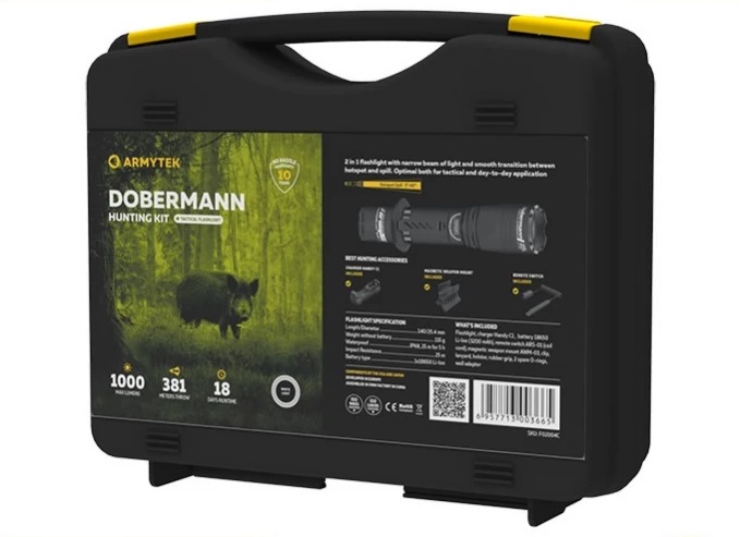 Фонарь с аккумулятором, быстросъемное магнитное крепление на оружие, выносная кнопка с витым шнуром и зарядное устройство с функцией Powerbank поставляются в прочном пластиковом кейсе, который удобно возить с собой. Нейлоновый чехол, стальная клипса и ремешок на руку обеспечивают комфортное повседневное ношение и применение фонаря.