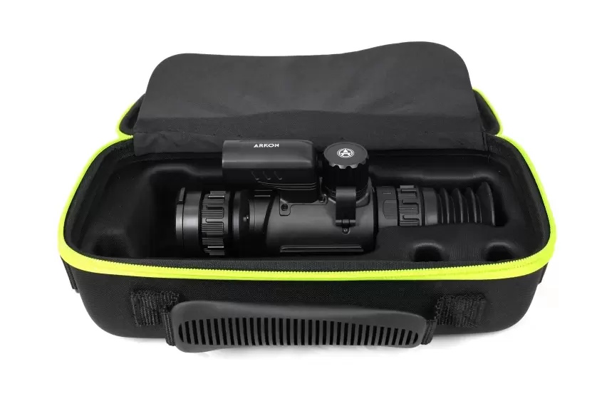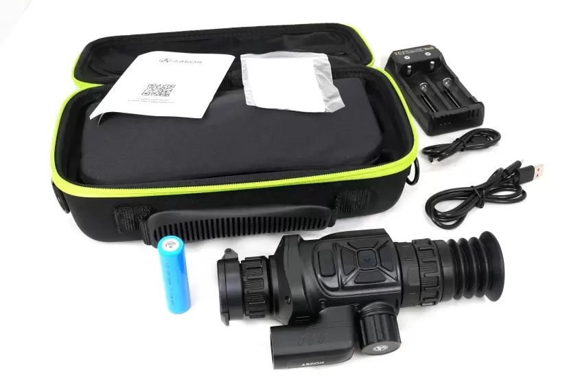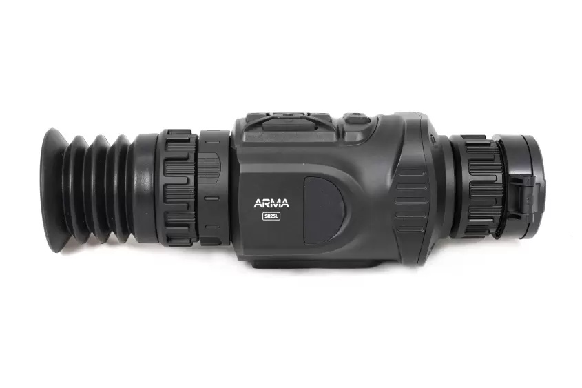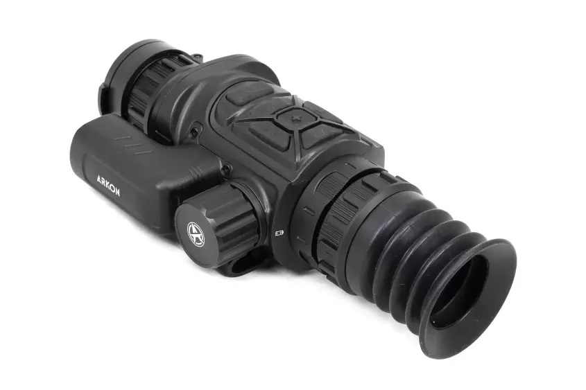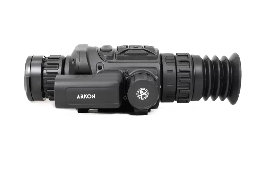 Оптический модуль Arkon Arma SR25 построен на длиннофокусном германиевом объективе 25мм/F1.0, имеющем показатель базовой кратности 3,1х. Для масштабирования изображения имеется цифровая функция Digital zoom, доступная в пределах от 1х до 4х. Благодаря этому максимальное увеличение составит 12,4х. Угол пространственного поля зрения FOV (Field of view) на минимальной кратности равен 7.0°×5.4°. В линейных размерах стрелок будет видеть перед собой область пространства размером 12,2 на 9,4 метра на удалении 100 метров. Фокусировка на дистанцию выполняется вручную, поворотом низкопрофильного кольца на объективе.